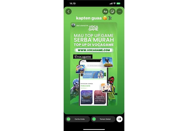 Yang menarik, dalam waktu yang hampir bersamaan, di Instastory keduanya meng-update sebuah penyedia layanan pembelian credit game yaitu VocaGame.
