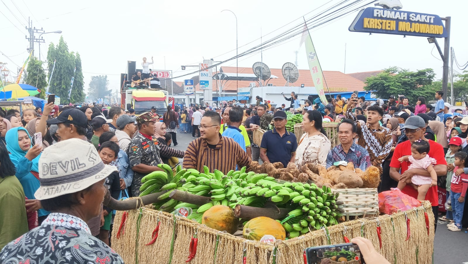 Tradisi ini menjadi bentuk ungkapan syukur kepada Tuhan atas panen dan rezeki berlimpah. Beragam hasil bumi seperti padi, sayuran, dan buah-buahan menjadi hiasan utama arak-arakan, yang melibatkan blok Mojowarno, Mojowangi, Mojoroto, Mojodukuh, Mojojejer, Pepanthan Mojotengah, serta RSK Mojowarno.