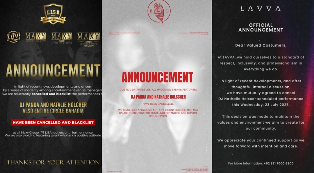 Tak butuh waktu lama, gelombang protes merembet ke dunia hiburan malam. Sejumlah promotor dan pengelola club malam mulai mengambil langkah tegas dengan membatalkan seluruh jadwal panggung Nathalie Holscher.
