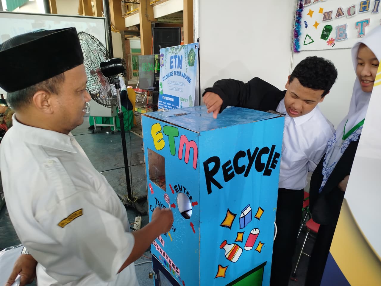 Dari sekian banyak produk yang dipresentasikan, salah satu yang paling mencuri perhatian adalah inovasi dari Kelompok 1 Kelas 9A yang diberi nama Exchange Trash Machine (ETM).