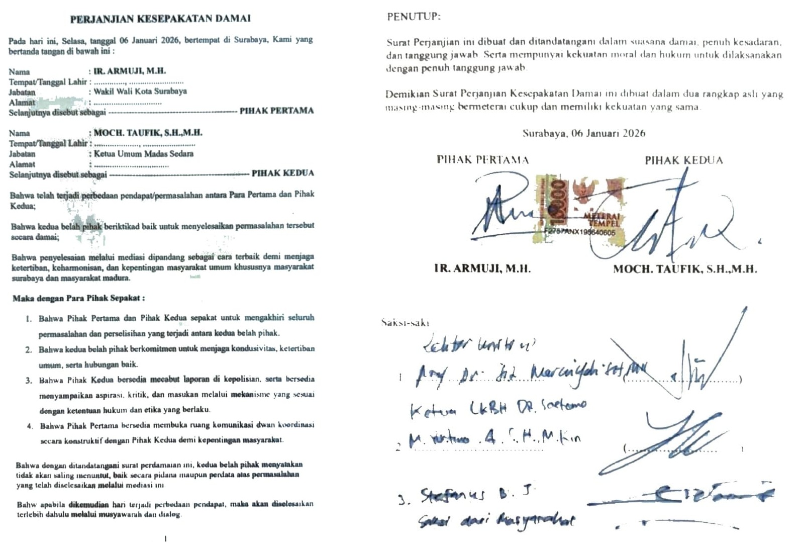 Padahal, pertemuan tersebut sejatinya menjadi titik temu kedua belah pihak untuk mengakhiri konflik yang sempat menimbulkan ketegangan. Kesepakatan damai itu ditandatangani langsung oleh Ir. Armuji, MH selaku Wakil Wali Kota Surabaya, dan Moch. Taufik, S.E., S.H., M.H., Ketua Umum Madas Sedarah.